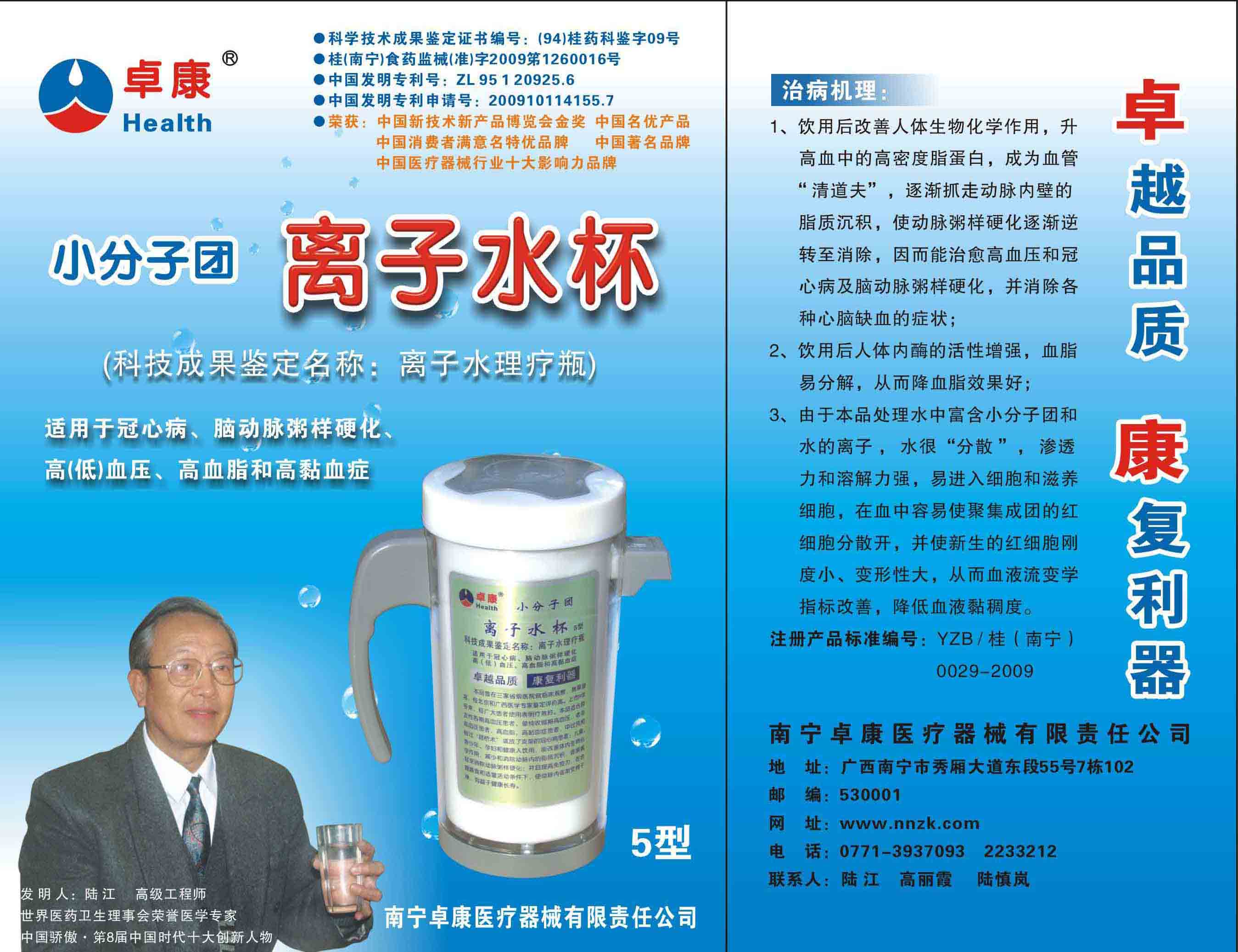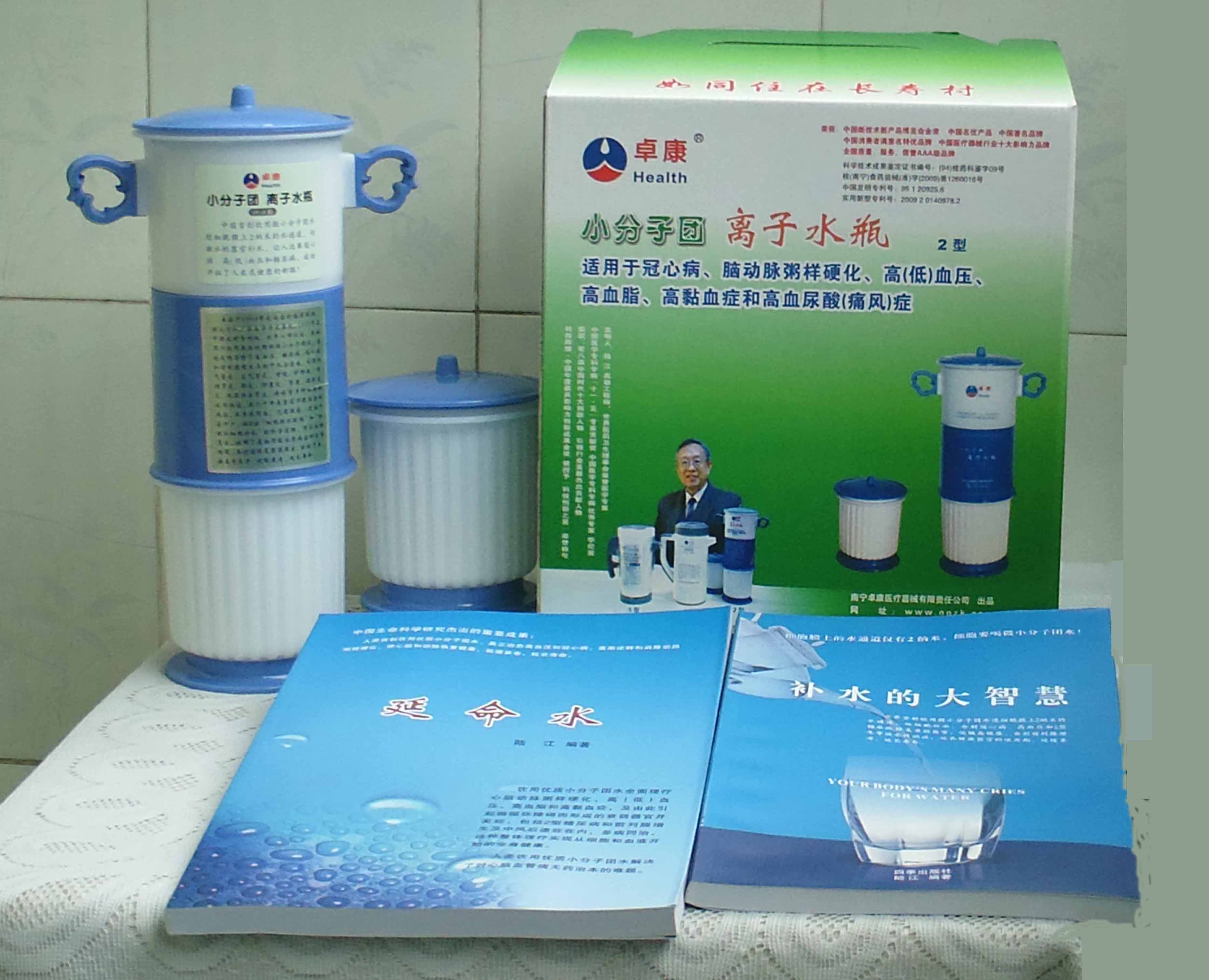 本品大量用戶的使用效果表明,能治愈冠心病、腦動脈硬化、原發(fā)性高(低)血壓、高血脂、高粘血癥、高血尿酸癥(痛風)和2型糖尿病、衰弱器官并發(fā)癥(前列腺增生、腎衰與尿毒癥)及中風后遺癥等療效好。產品配信譽卡。使用壽命30年,不換芯,易清洗。團購優(yōu)惠。從郵局匯款,匯費1%,地址按本頁下方地址、聯系人寫。從銀行匯款,請點擊[聯系匯款]欄,從工商銀行匯款,建設銀行、農業(yè)銀行匯款,均免收匯費,匯款后20--30分鐘內發(fā)短信,可用微信轉帳,均免匯費,微信號即手機號13768308380。匯款后,告知你的姓名和地址,我公司聯系人手機號是:13768308380。卓康牌離子水瓶為我公司獨家生產,郵購產品配《補水的大智慧》彩印書一本,另配四季出版社出版的新書《補水的大智慧》一本,并配光盤一張(含央視主持人釆訪陸江的對話視頻)。目前市場和"淘寶網"上有人兜售假冒的偽品,望讀者審察辯別真?zhèn)危旒僬哓飧`假冒本公司的各種認證、獲獎獎項、專利號和外包裝盒上的中英文字,包括科技成果的鑒定意見等,請讀者注意防偽。如何識別假貨?已經買了假貨怎么辦?(請點擊[打假掠影][打假掠影])。